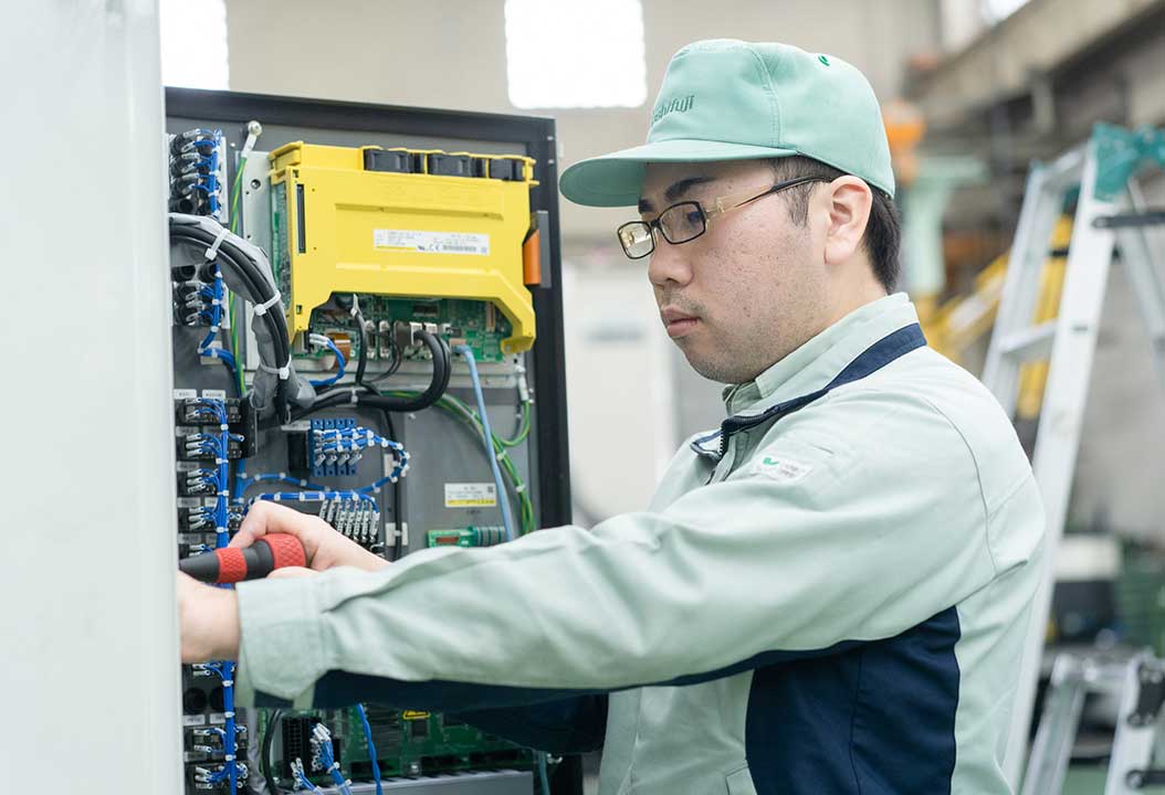 組立て後の機械は見た目こそ完成していますが、まだ動きません。その状態から電源を投入し、⻭車を加工できる状態にします。お客様に最高品質の製品をお届けするため、細部にわたるチェックと調整を行います。